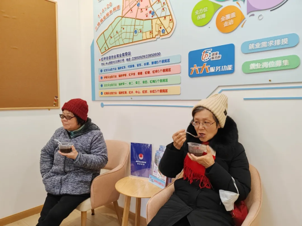 今天一大早,宁聚里·虹桥街道虹南党群服务站里就人气十足。许多居民从家中赶了,只为喝上一碗暖暖的腊八粥。这碗由万宏养老集团精心烹制的腊八粥,包含了黑米、小米、莲子等丰富的食材,考虑到老年长者的饮食习惯,粥里没有加糖,而是用红枣来增加腊八粥的甜味。