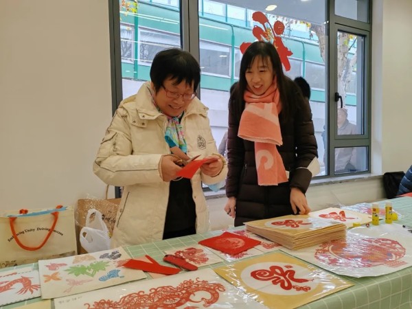 服务站的另一边也非常热闹,书法老师挥毫泼墨,书写出充满吉祥寓意的“福”字;剪纸老师则拿着剪刀在红纸上灵活翻飞,一个蜿蜒的蛇形“福”字便一气呵成......