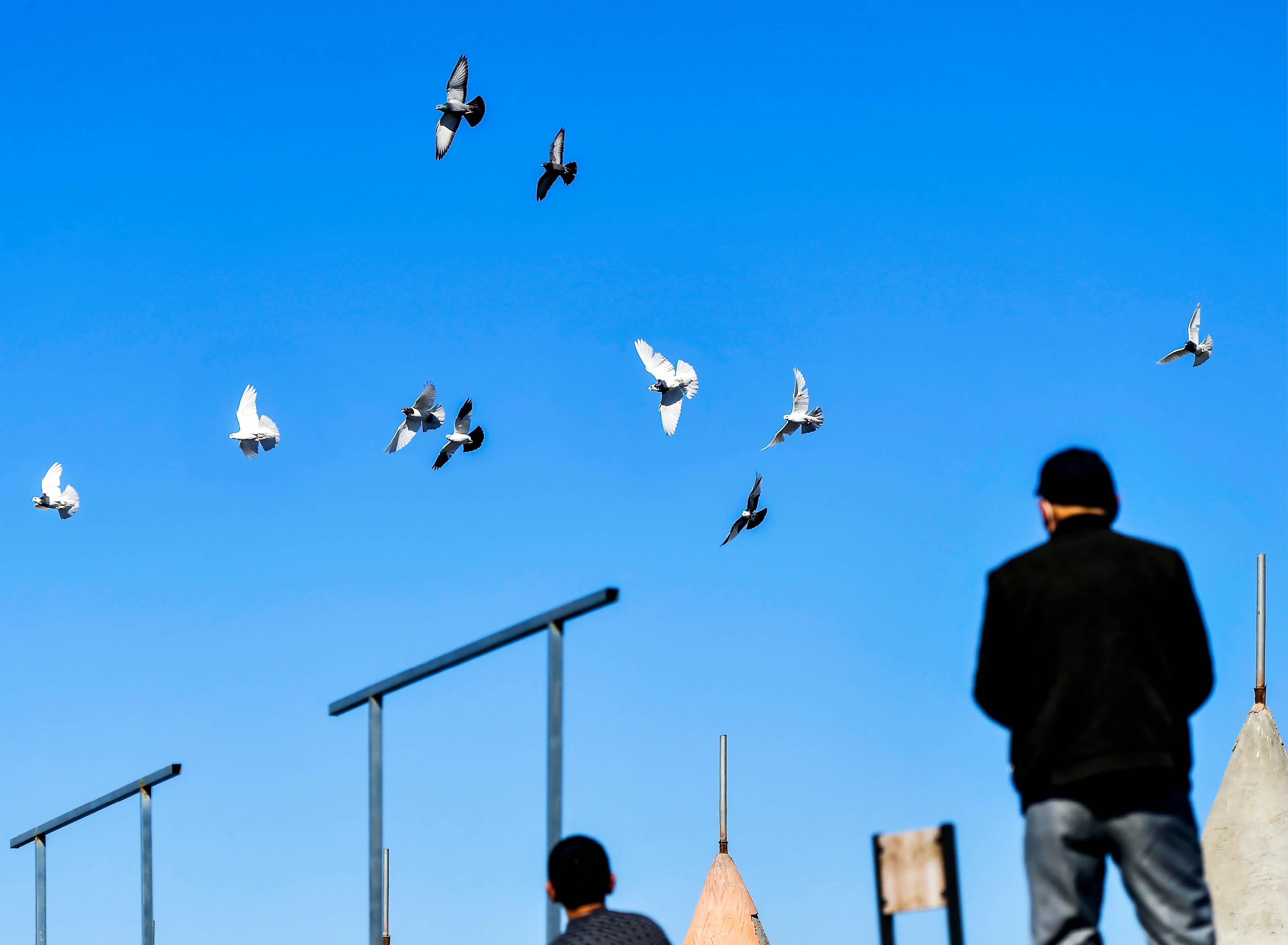 上图:2023年3月10日,新疆乌鲁木齐市,翻翻鸽俱乐部精英对抗赛在该市神木源景区举行,裁判根据鸽子在规定的时间内在空中旋转的周数、转姿、品相等评出获胜鸽子。