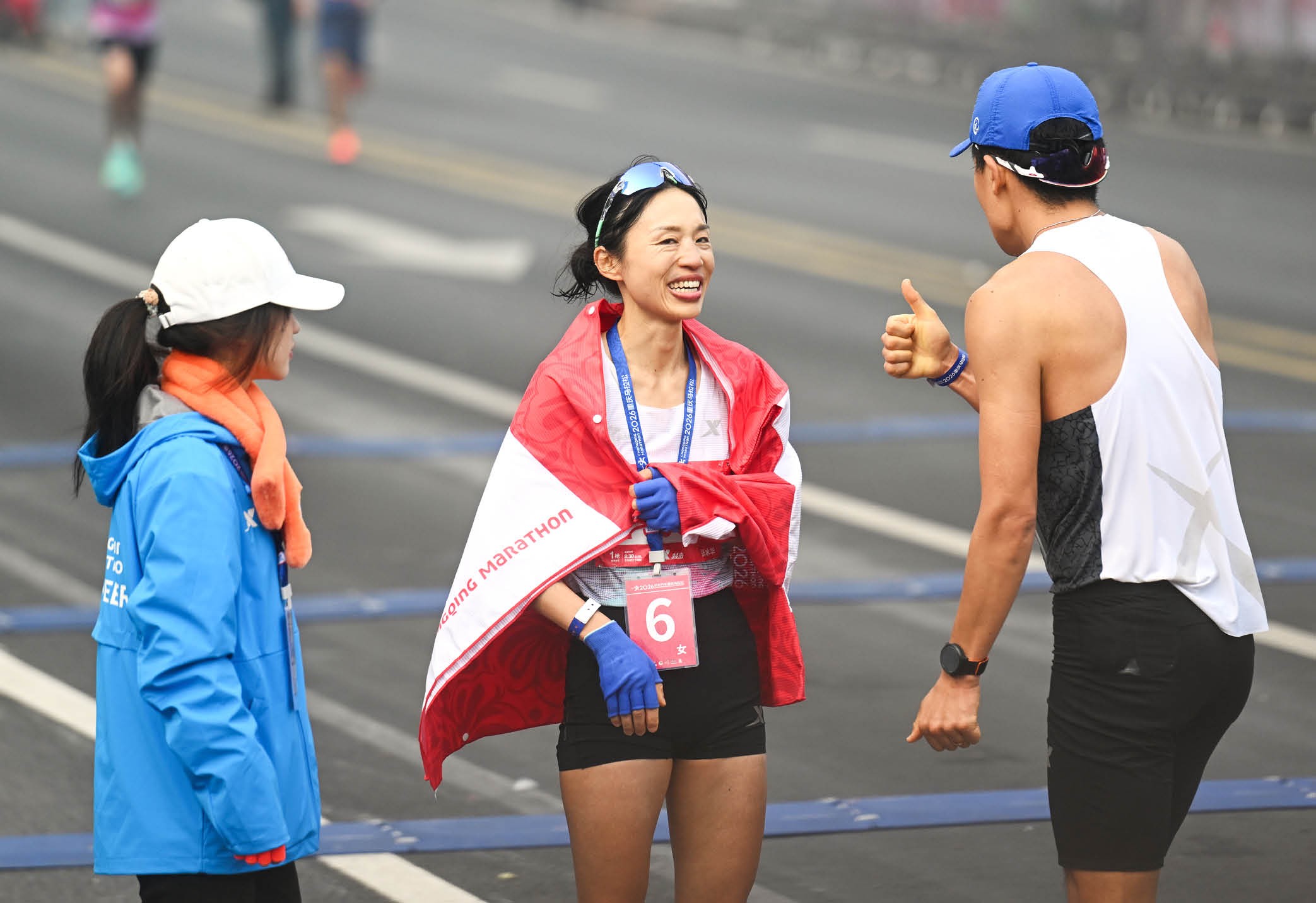 比赛途中,张水华的膝盖上涂抹着扶他林,隐隐透露出伤病的困扰,但她丝毫没有被影响。赛道两旁,热情的重庆市民扯着嗓子,用方言喊着 “水华加油”,助威声如同冬日里的一团火,温暖又鼓舞人心。