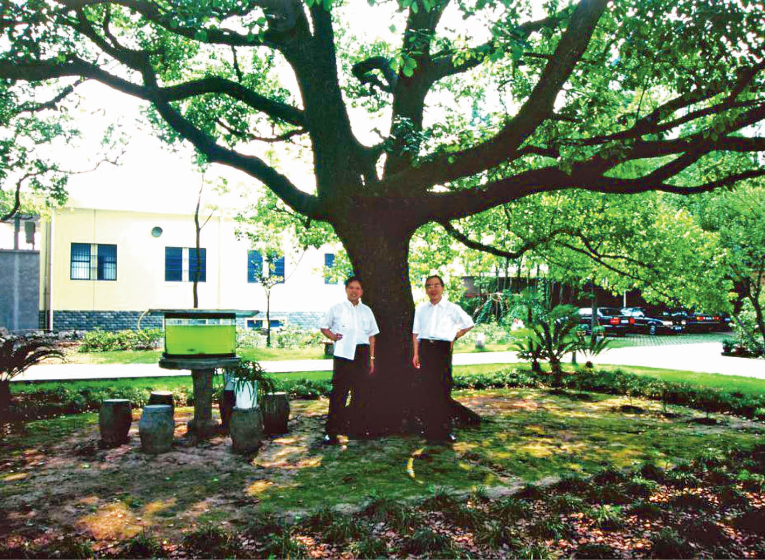 上图:伍江(左)与毛佳樑在大树前留影。摄影/叶梅唐