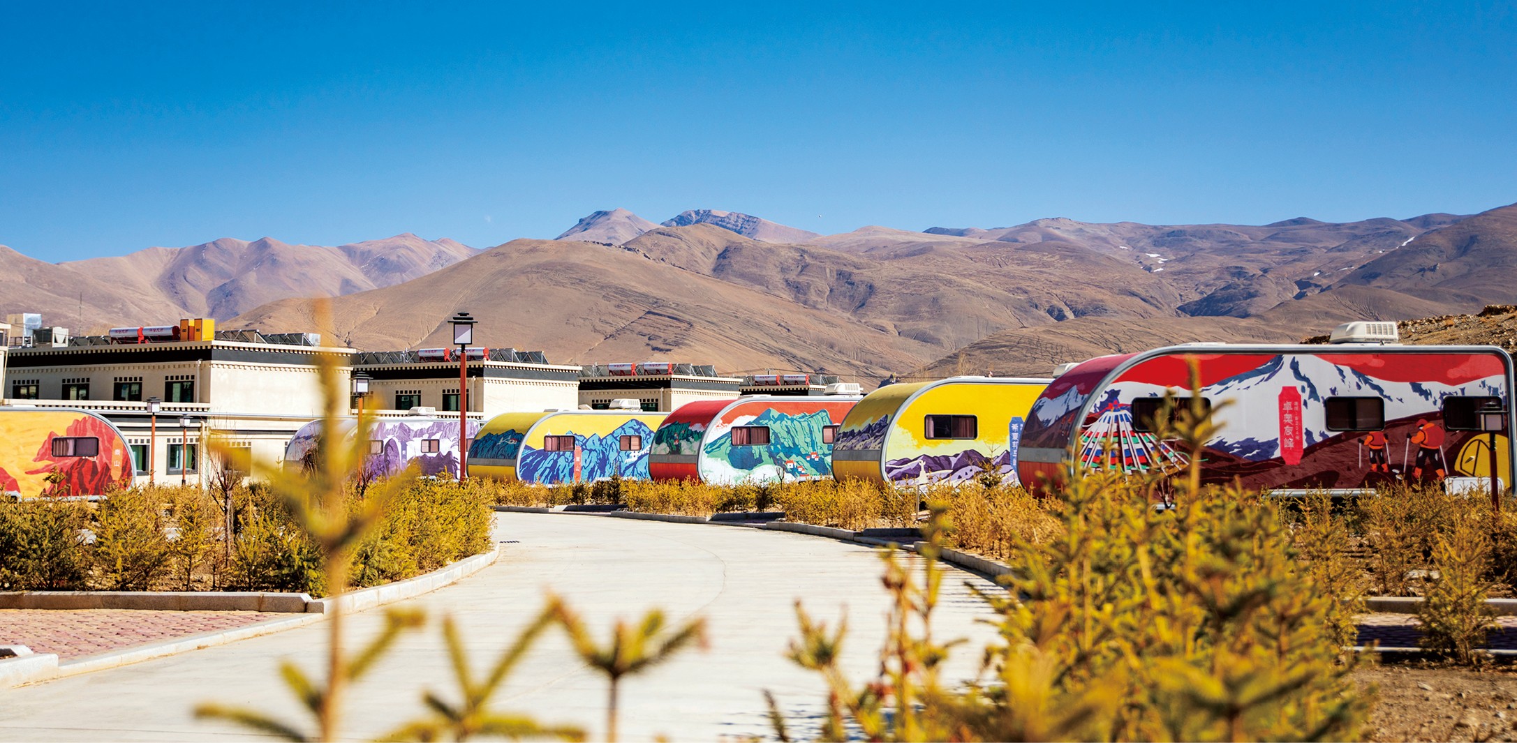 如今的珠峰小镇已是定日一张闪亮的名片。一条笔直的大道将小镇一分为二,左边是当地村民自己修建的房屋、商铺;右边是上海援建的小镇主体,包括商业街广场、登山体验馆、房车营地、酒店等。