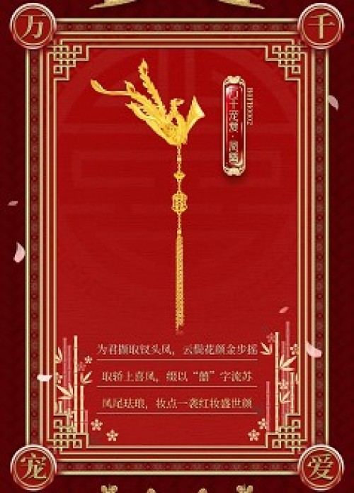 在当代,步摇不仅传承了前世的神韵与精髓,更融入了创新的设计理念,周大生×国家宝藏系列“万千宠爱”凤簪便是这一演变的典范。 其整体设计以凤、步摇为设计灵感,主体部分采用繁复的黄金工艺,展示灵动富丽的凤凰华姿,尽显奢华风范,并寄意“从此三千情丝为君独挽,愿夫妻琴瑟和鸣”的美好祝福。
