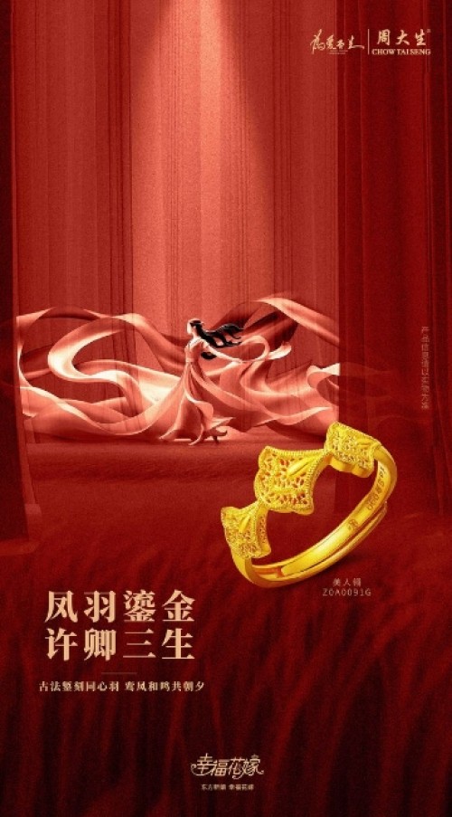 除了“龙凤呈囍”对戒,周大生幸福花嫁系列“美人翎”婚戒同样也承载着美好寓意。“美人翎”以凤羽为型,灵动飘逸,恰似凤凰展翅翱翔于天际,优雅而灵动,尽显东方美学的神韵。其设计不仅融合了传统婚俗文化的精髓,更将对爱情的忠贞与美好的祈愿融入其中。“美人翎”上精心雕琢的花嫣草元素,寓意着“除你之外,再无他爱”的深情告白,为东方新娘勾勒出“十里红妆,风光大嫁”的绮丽画卷,传递对婚姻的忠贞与对幸福的祈愿。周大生通过“美人翎”婚戒,不仅传承了传统婚俗文化中的忠贞与美好,更赋予了现代婚嫁饰品深厚的情感内涵,为新人的婚礼增添了一份庄重与神圣,使其成为一生中难忘的珍贵记忆。