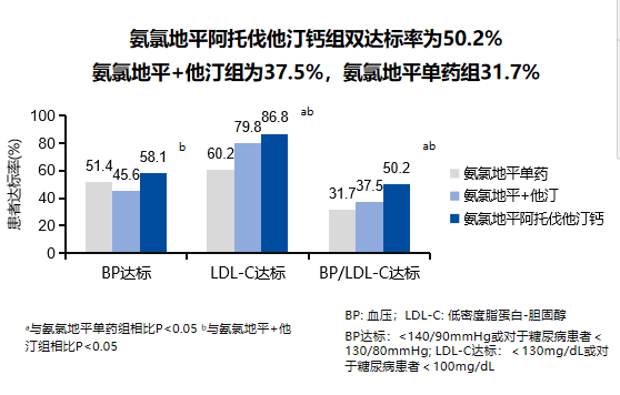 图二:与氨氯地平单药或氨氯地平+他汀自由联合相比,氨氯地平阿托伐他汀钙片显著提高血压/血脂双达标率