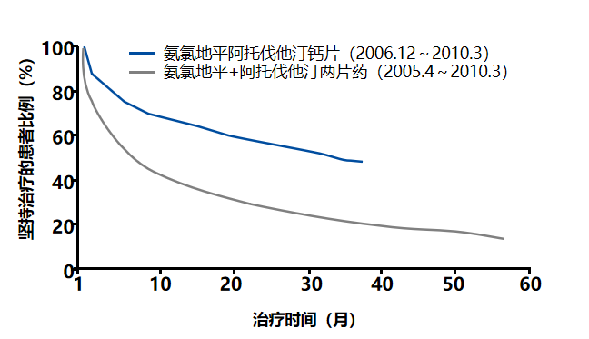 图一:与服用两片药(氨氯地平+阿托伐他汀)对比,服用单片药(氨氯地平阿托伐他汀单片复方制剂)的患者12个月坚持治疗的比例提升26%