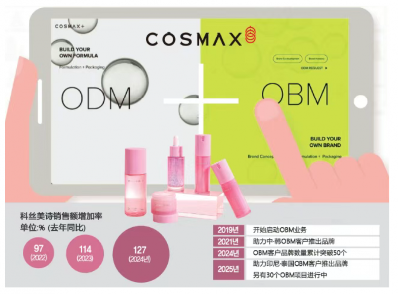 自2019年启动OBM业务并经过两年筹备,科丝美诗COSMAX于2021年在韩国和中国市场成功推出首批OBM合作品牌。此后,OBM业务展现出强劲的增长态势:OBM服务收入在2022年同比增长97%,2023年增长114%,去年增幅更高达127%,持续验证其市场价值与模式的成功。