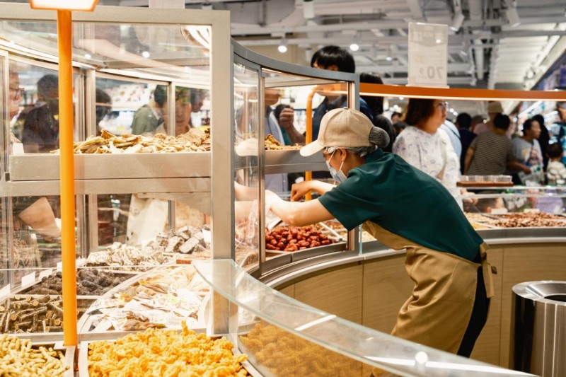 现制现售区成为全场焦点:烘焙区面包出炉,甚至等不到放上货架便被抢购一空,馥郁麦香弥漫空中;熟食区现场烹制的烟火气令人驻足;日料区精致氛围吸引众多顾客。这些明厨亮灶的展示方式让顾客买得格外放心,新鲜出炉的欧式面包、手工面点和日式寿司成补货“永动机”。一位年轻白领兴奋表示:“这种久违的烟火气,热烘烘的炒瓜子油脂香窜进鼻子,让人果断称两斤带走。”