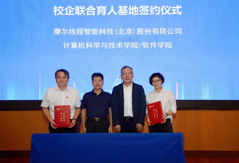 图示:哈尔滨工业大学(威海)计算机科学与技术学院/软件学院院长初佃辉教授、副院长张维刚教授与摩尔线程签署联合育人基地协议