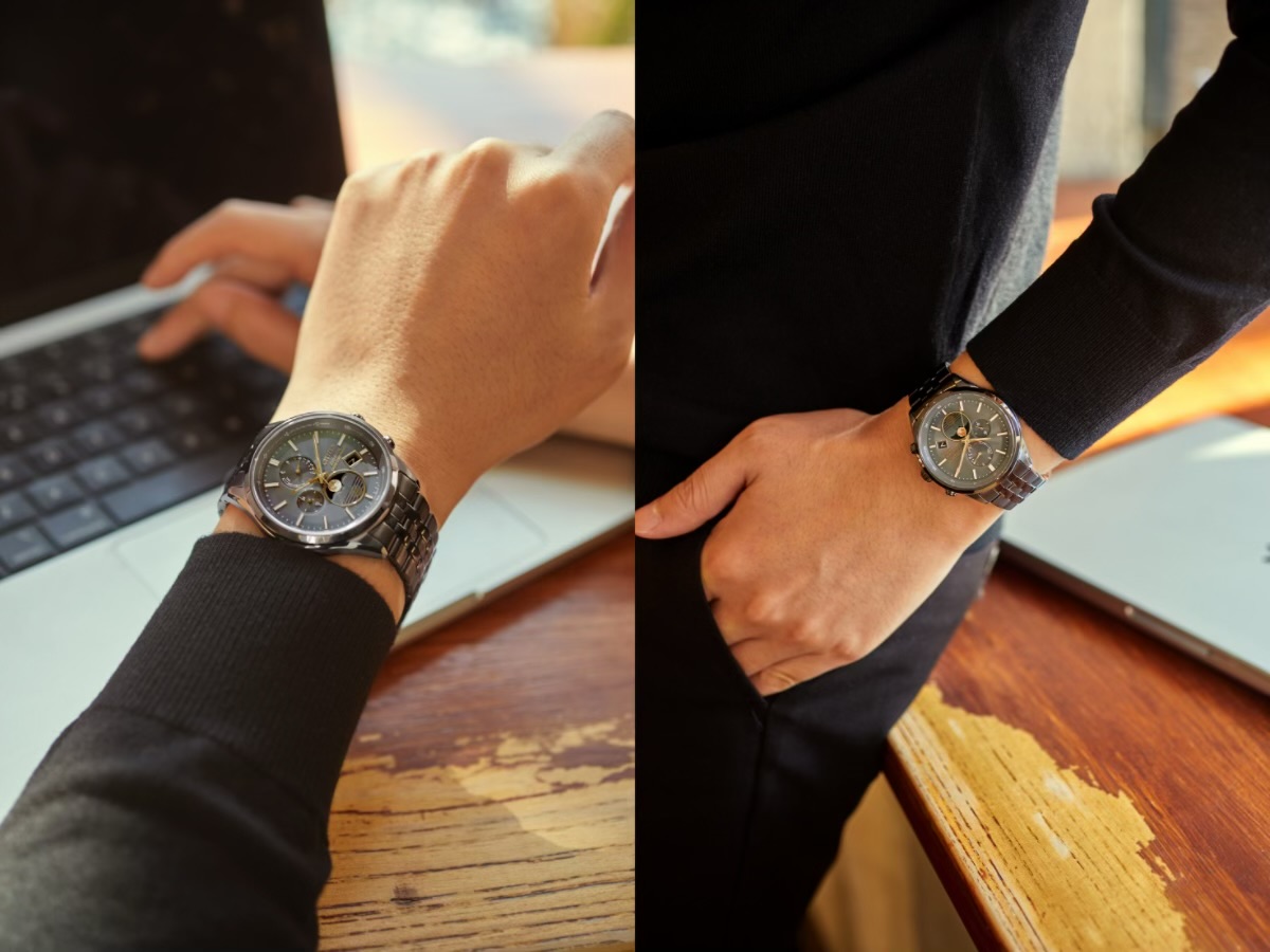 两款西铁城空中之鹰电波对时腕表皆以灰黑为表盘底色,严谨却不古板,仿佛黑西装下透出尽在掌握的松弛感,更加适配商务休闲场景,也能更好凸显表盘上的功能区:月相窗位于6时位,以立体磨砂纹理模拟环形山,随电波信号完成月相盘的盈亏轮转;9点位的24小时表盘与之呼应,结合24时区外圈和星期显示,整个表盘像雷达屏幕般将全球时间尽收眼底。