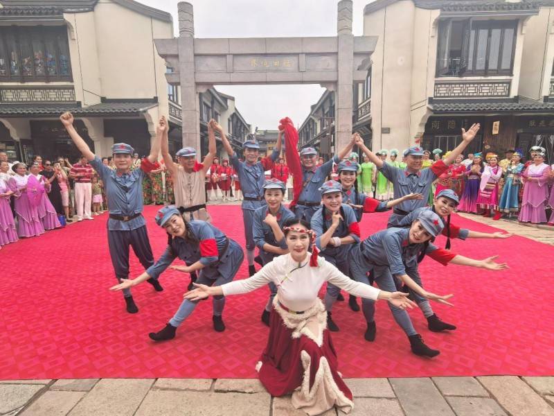 莲花牌楼处,《水乡新娘和故乡情》将“水乡新娘”的柔美意象与故土眷恋深度融合,让观众在视觉与听觉的交织中,仿佛置身烟雨江南。情景式舞蹈《红色记忆东方红》则带领观众重温红色岁月,唤醒时代记忆。