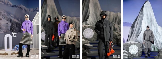 0℃「极寒雪山」主题秀,带领观众沉浸式登顶雪山之巅,展现出0℃下波司登的极致性能,在低温环境下,内胆外壳全套叠穿,即可不惧寒冷,锁住身体热量。
