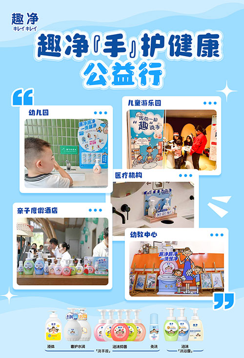 今年,该活动已向全国百余家幼儿园、儿童乐园及亲子酒店免费提供趣净泡沫抑菌洗手液及配套教育物料,旨在将 “认真洗手”的健康种子播种在孩子们心中,让这一良好习惯在家庭中生根发芽。