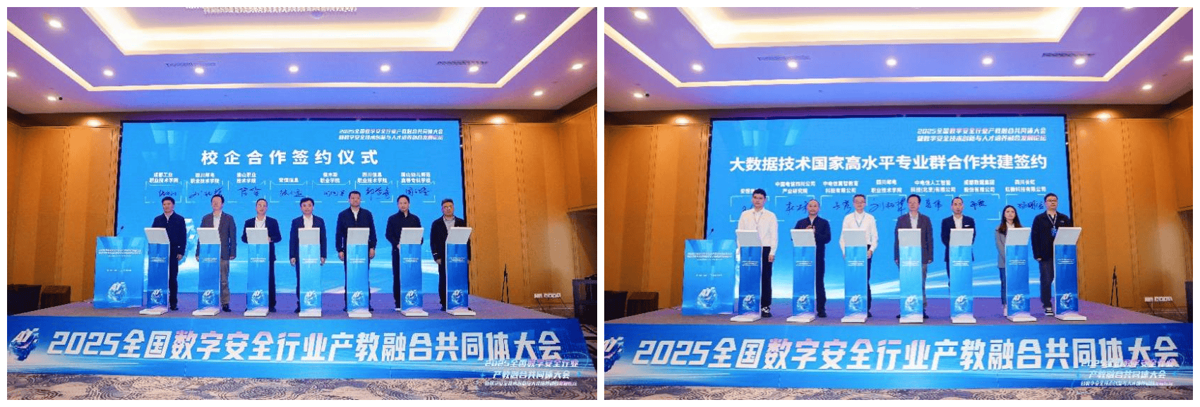 大会举行了多项战略合作签约仪式:校企合作签约环节,安恒信息党委书记、总经理张小孟与四川邮电职业技术学院党委副书记、校长刘柏桦,佛山职业技术学院党委书记管雪,佳木斯职业学院党委书记闫向军,四川信息职业技术学院党委书记郑学奇,成都工业职业技术学院校长张开江及唐山幼儿师范高等专科学校副校长周红星共同签署战略合作协议,此次合作将依托安恒的产业实践优势与院校的育人主体作用,探索精准育人新模式、强化协同创新,为数字安全产业构建人才后备军;大数据技术国家高水平专业群合作共建签约环节,四川邮电职业技术学院与安恒信息、中电信翼智教育科技有限公司、中电信人工智能科技 (北京) 有限公司等六家单位共建该专业群,面对国家发展数字经济的战略需求,此举将汇聚政校企多方资源,打造大数据技术人才培养高地;现场工程师学院揭牌环节,中国电信成都分公司与四川邮电职业技术学院将携手共建现场工程师学院,探索 “入学即入岗、毕业即就业” 的人才培养新模式。