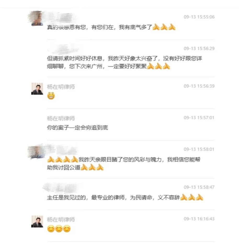 “真的很感恩有您,有您在,我有底气多了,但请抓紧时间好好休息,您下次来,一定要好好聚聚。”近期,杨在明又收到了来自委托人的积极评价,这样他感到由衷地高兴。