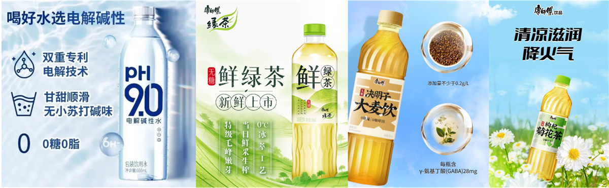 作为中国饮料巨头,康师傅饮品还积极拓宽茶饮赛道,进军功能水、中式养生饮等领域。比如拥有电解系统专利技术及新型电解槽专利技术的9.0电解碱性水,以“鲜茶、鲜榨、鲜萃”三重鲜科技为核心的无糖鲜绿茶,以及通过定制化烘焙曲线最大程度激发谷物自然香气的中式养生茶等,康师傅饮品依靠技术创新实现产品体验的跃迁,让饮品不止“好喝”,还要“喝好”。