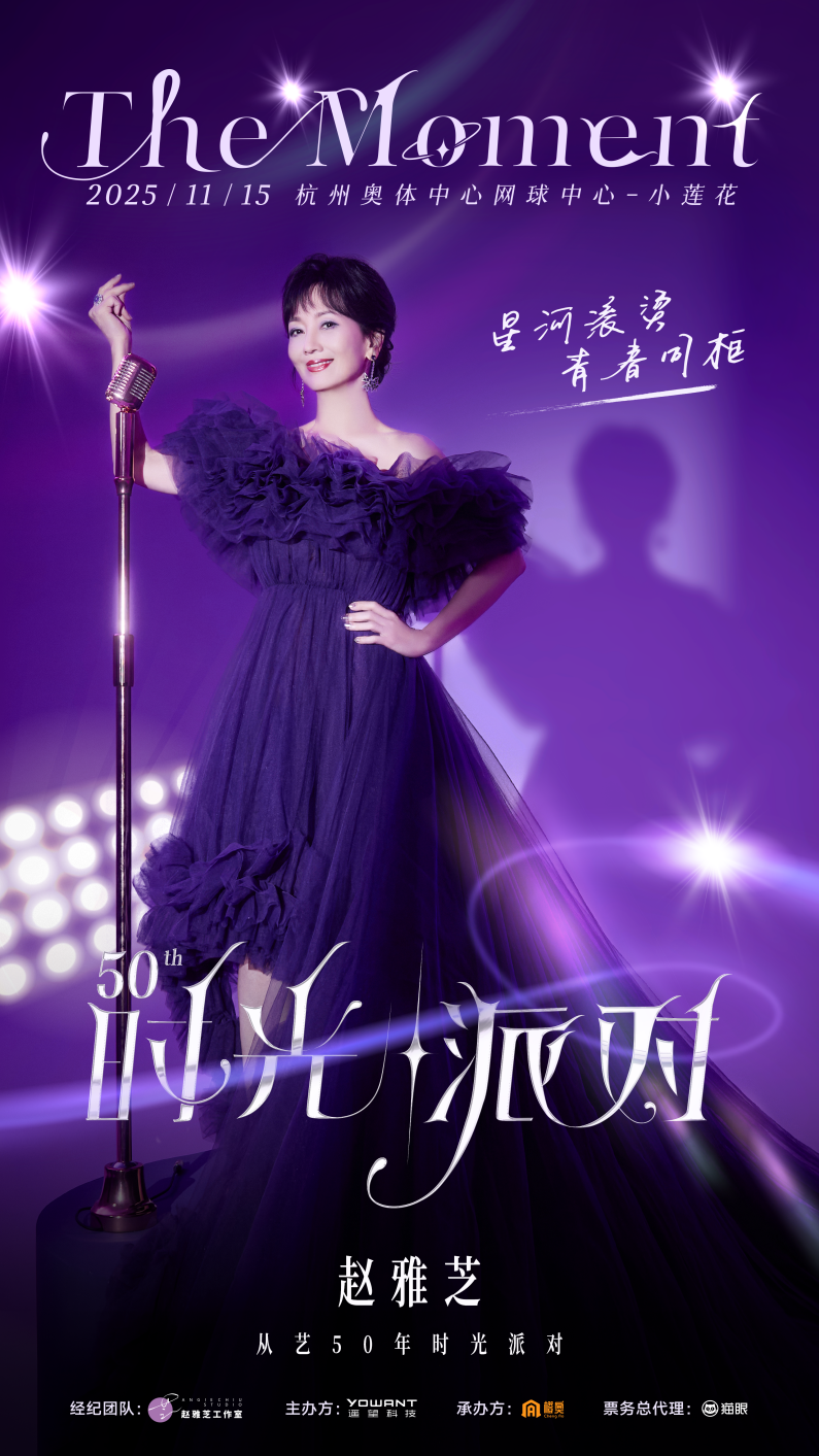 《芝因有你·赵雅芝从艺50周年时光派对》正式官宣!11月15日19:00,72岁的传奇女星赵雅芝将在杭州奥体中心网球中心(“小莲花”)举办个人演唱会,以此致敬跨越半个世纪的艺术生涯。本场演出由遥望科技策划出品,猫眼独家售票。