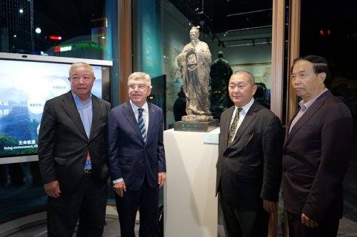 当天下午的艺术广场之行中,巴赫主席为艺术展剪彩,并深入参观袁熙坤的个人艺术展。面对袁熙坤为其精心创作的肖像雕塑,巴赫不禁驻足欣赏,并欣然合影留念,成就了“巴赫遇见巴赫”这一佳话。参观过程中,巴赫对作品赞不绝口,由衷赞叹其对体育人物精神风貌的精准捕捉。袁熙坤作为首位荣获联合国“环保艺术大师”称号的中国艺术家,在国际艺术界享有盛誉,他曾为现代奥林匹克之父顾拜旦、前国际奥委会主席萨马兰奇以及巴赫本人创作了一系列神形兼备的雕塑作品,以独特的艺术形式凝固了奥林匹克领袖的风采,成为体育人文记忆的珍贵载体。