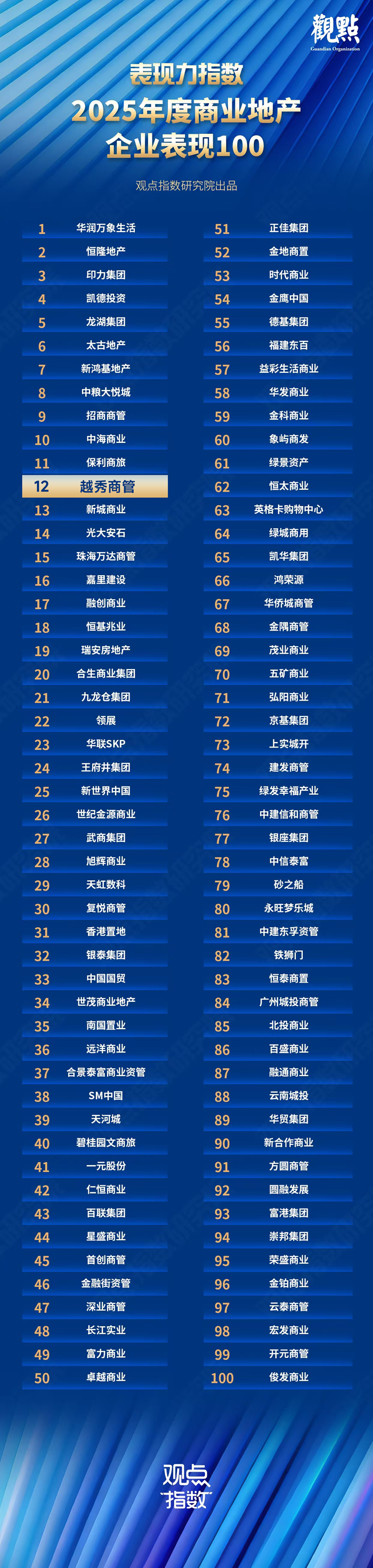 越秀商管荣膺“2025年中国商业地产企业TOP100”第12位