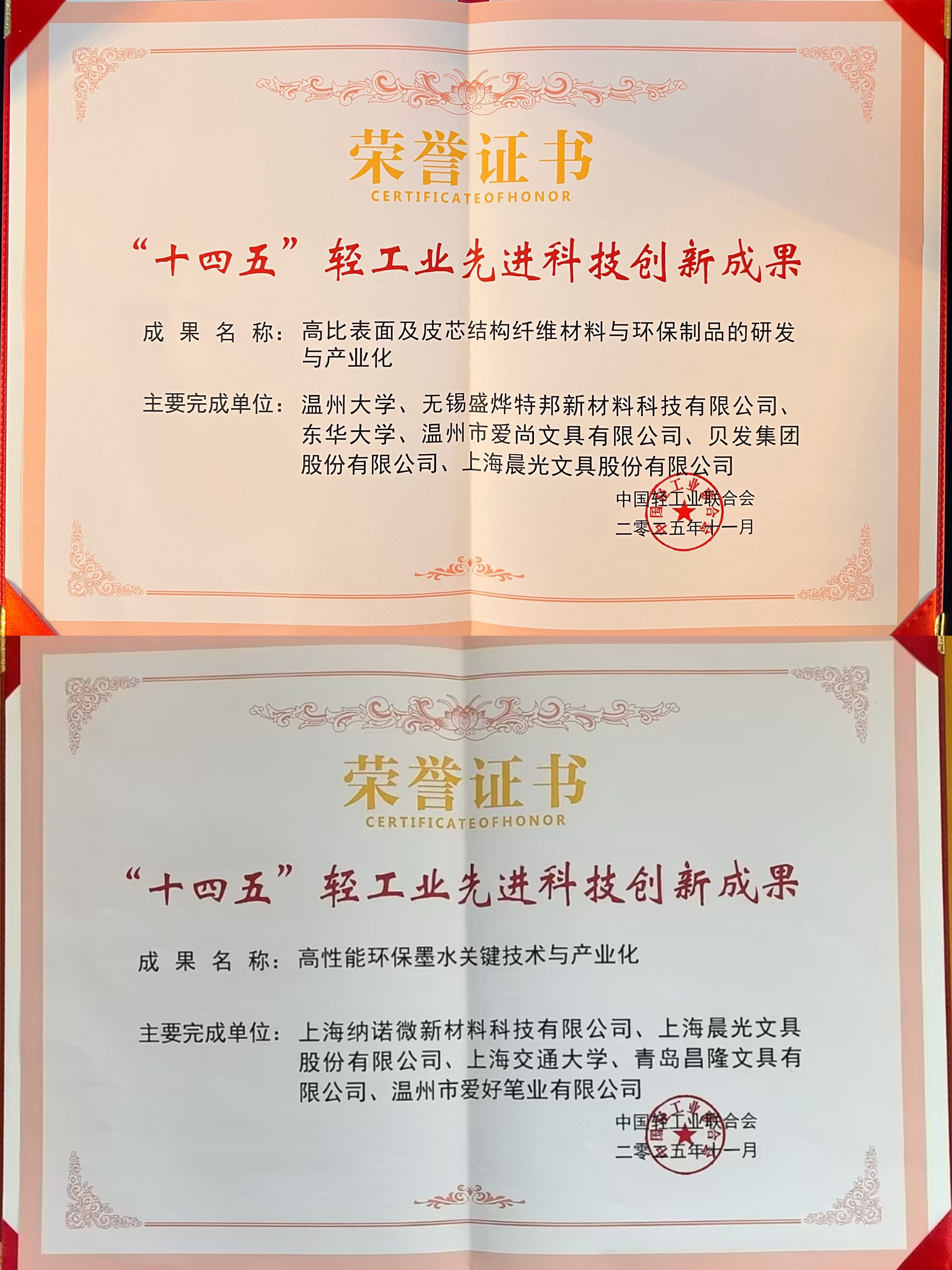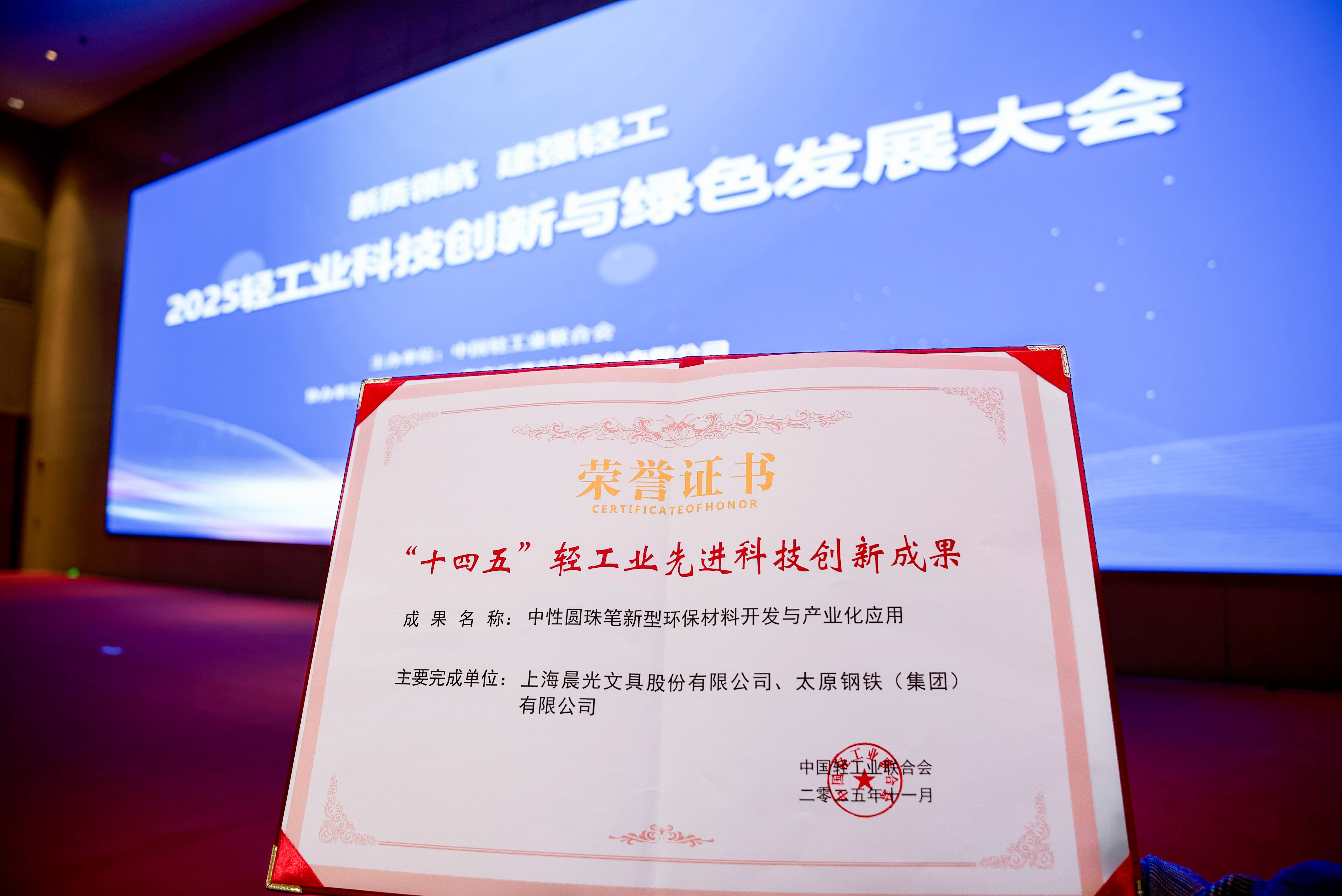 2025既是“十四五”规划的收官之年,也是“十五五”规划开局的重要节点。11月11日,由中国轻工业联合会主办的2025年轻工业科技创新与绿色发展大会在南京隆重召开,由晨光文具主负责、太原钢铁参与的《中性圆珠笔新型环保材料开发与产业化应用》项目,以及晨光文具参与的《高性能环保墨水关键技术与产业化》、《高比表面及皮芯结构纤维材料与环保制品的研发与产业化》项目成功获选“十四五”轻工业先进科技创新成果。