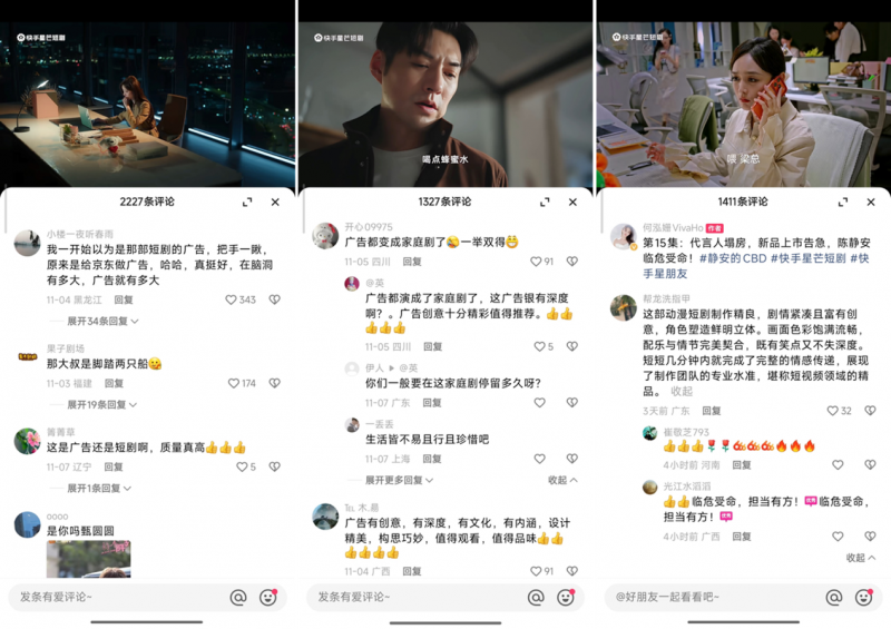 近年来,京东就从尝试单剧番外植入到定制品牌短剧,从布局全周期短剧营销到实现批量化短剧矩阵传播,与快手星芒短剧合作的深度与广度在不断拓展。京东的频繁复购,也充分印证了快手星芒短剧的商业吸引力:其全链路触达能力不仅能助力品牌当下的生意经营,剧集沉淀下来的海量兴趣人群也将为品牌带来更丰富的长远价值。