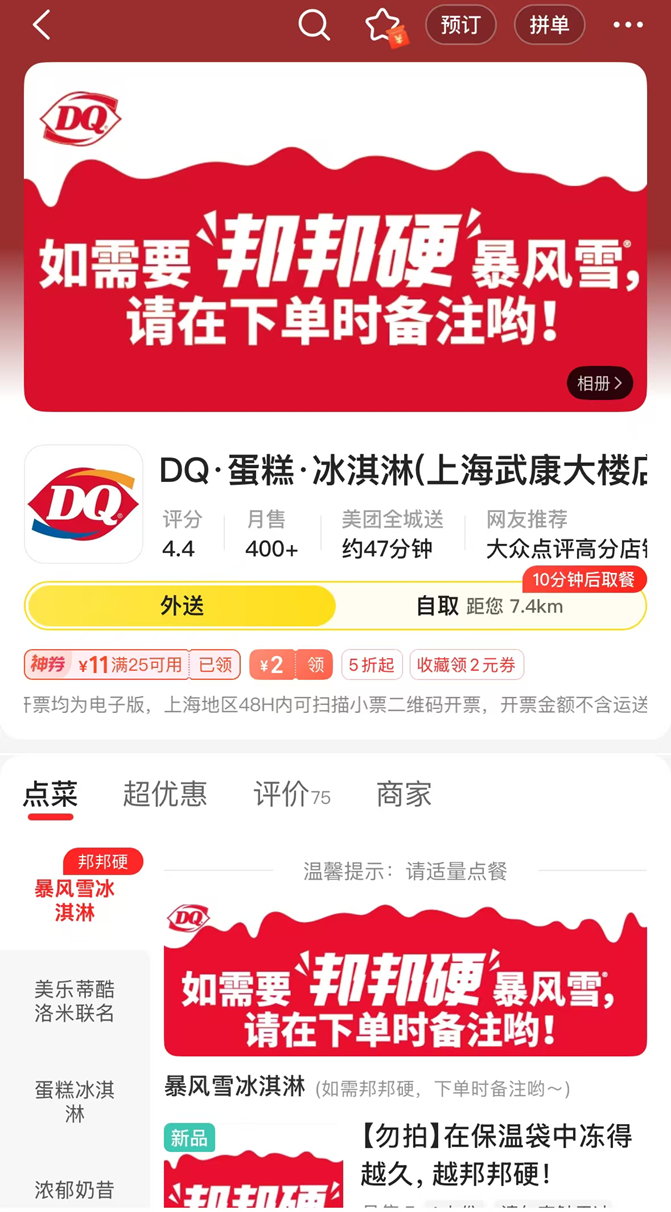 近日,有消费者在观看热门电影《疯狂动物城2》时,通过外卖平台订购了DQ的暴风雪系列冰淇淋。借助配送包装中配备的干冰与保温袋,冰淇淋送到手时,用勺子敲击冰淇淋表面能发出清脆声响。且在长达近两小时的观影结束后,它仍保持坚硬固态。这种被网友形象描述为“邦邦硬”的状态,完美解决了在影院享用冰淇淋时,产品融化过快、滴漏不便的核心痛点。