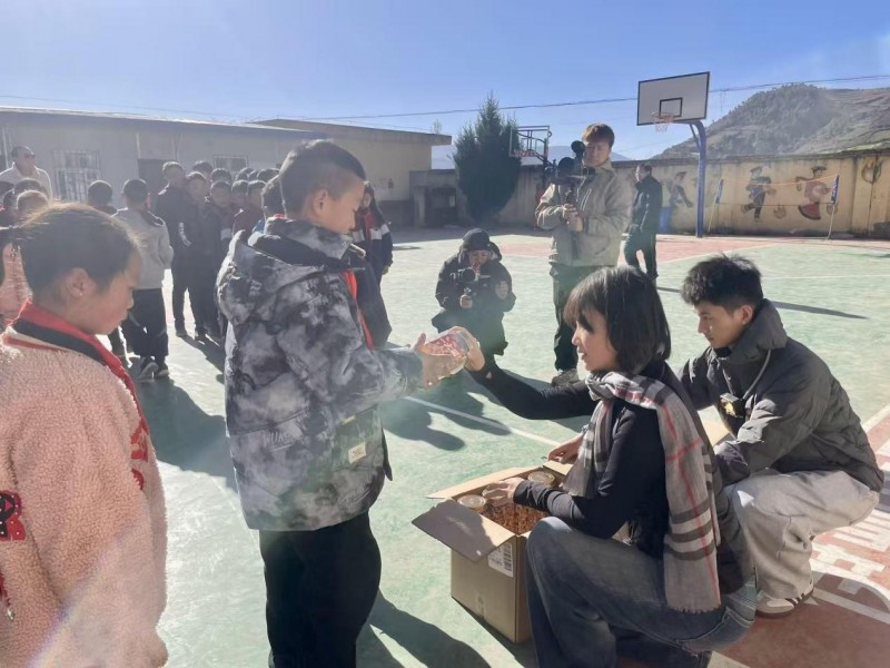 这是三只松鼠“暖冬公益行动”的其中一个场景。在凉山的几天里,志愿者们走访了多所学校,将零食与文具亲手送到孩子们手中。志愿者们捧着三只松鼠的礼盒走进校园,一个孩子主动上前帮忙接过零食箱——箱身上鲜明的松鼠logo,映着孩子被高原阳光晒得红扑扑的脸颊,成了镜头里温暖又生动的一幕。孩子们排着队,依次接过志愿者递来的坚果礼盒,有人低着头腼腆地笑了,眼里闪着明亮的光。