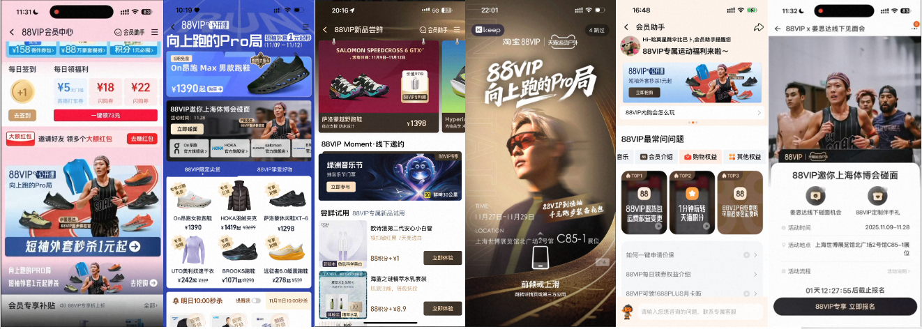 今年双十一期间,国内领先的会员平台淘宝88VIP联合天猫运动户外行业,携手HOKA、On昂跑、SALOMON、BROOKS、UTO、必迈六大头部运动品牌,重磅推出“向上跑的Pro局”跑步品类专题营销。88VIP以“是88VIP,也是品牌的VIP”为核心态度,邀请姜思达担任“88VIP跑步体验官”,从内容种草到专属权益,再到上海体博会线下展区,构建了一场覆盖千万跑者的运动盛宴。