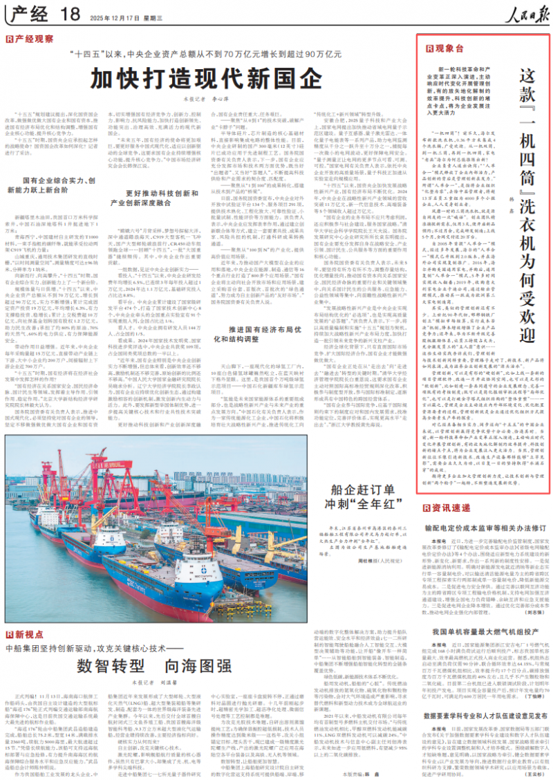 12月17日,《人民日报》第18版“观象台”栏目聚焦海尔“一机四筒”洗衣机走红背后的深层逻辑,高度点赞了其以管理创新赋能产品突破的高质量实践,引发广泛关注。