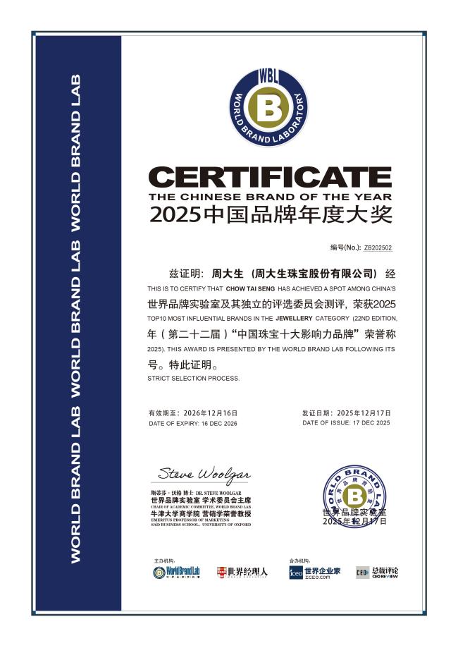 “中国品牌年度大奖”素有“中国品牌奥斯卡”之称,在业界具有深远影响。据世界品牌实验室学术委员会主席、牛津大学赛德商学院荣誉教授斯蒂芬•沃格介绍,该奖项已连续发布22年,成为反映消费者品牌偏好变化的重要晴雨表,其核心评判标准为品牌影响力。本次评选历时半年,覆盖全国100多个行业/品类的逾3000个知名品牌,综合评估品牌影响力指标、企业年度销售收入、主营利润、消费者评价及行业贡献等多项维度,最终评选出三大类奖项。周大生此次斩获其中两大类奖项,既是对品牌长期坚持产品创新、品质保障与优质服务的高度肯定,也标志着其在行业地位的进一步巩固与提升。