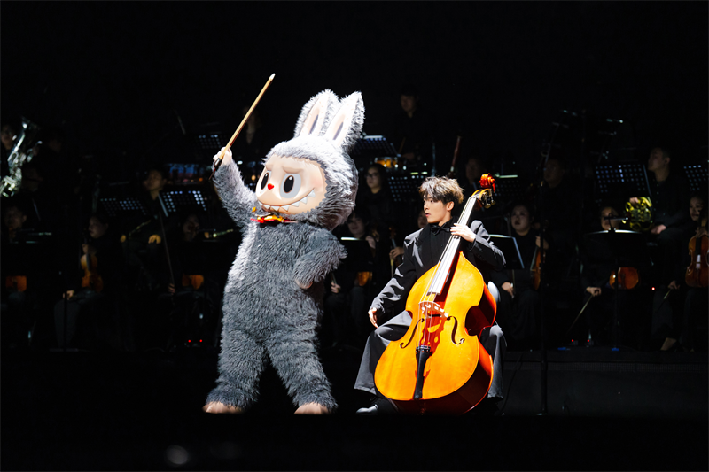 演出当晚,随着全场灯光渐暗,观众席中荧光棒如星海流动。在众人期待中,头戴礼帽的小金LABUBU走向舞台中央,接过乐团指挥的指挥棒。紧接着,YAYA、SPOOKY、TYCOCO、MOKOKO等精灵伙伴从舞台各处灵动现身,各司其职融入乐团。小灰LABUBU凑近低音提琴手,调皮地抢夺琴弓,仿佛向观众宣告——这场音乐盛宴,正式由精灵天团接管。