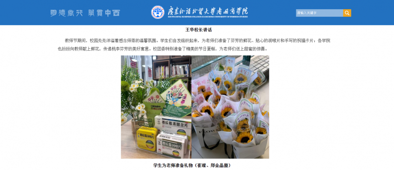 值得关注的是,本次活动也获得了广东外语外贸外贸大学南国商学院的官方认可与支持。院校校长表示:教师节期间,校园处处洋溢着感念师恩的温馨氛围。学生们自发组织起来,为老师们准备了芬芳的鲜花、贴心的润喉片和手写的祝福卡片。各学院也纷纷向教师献上鲜花,传递桃李芬芳的美好寓意。让此次活动更是将商业资源与教育关怀完美结合的创新实践,为企业参与教育事业发展提供了新范式!