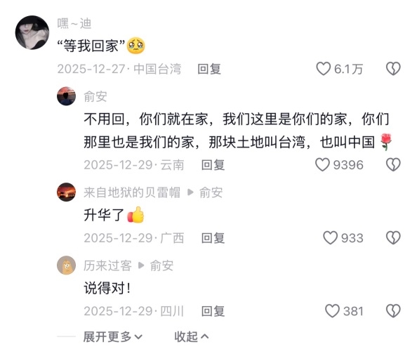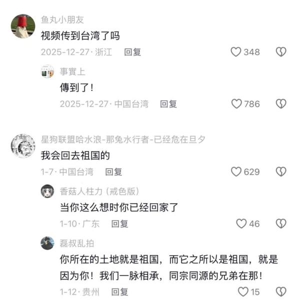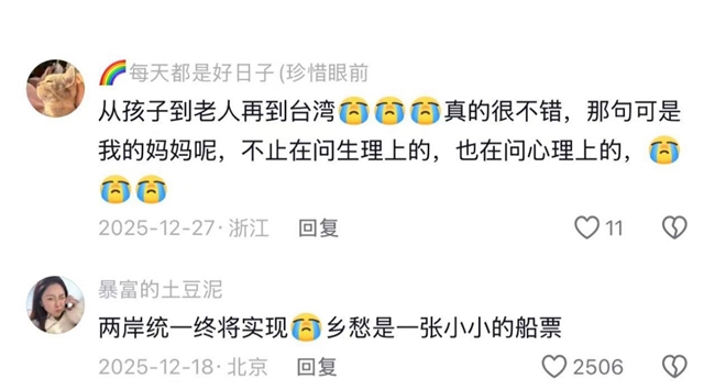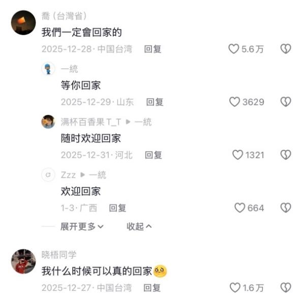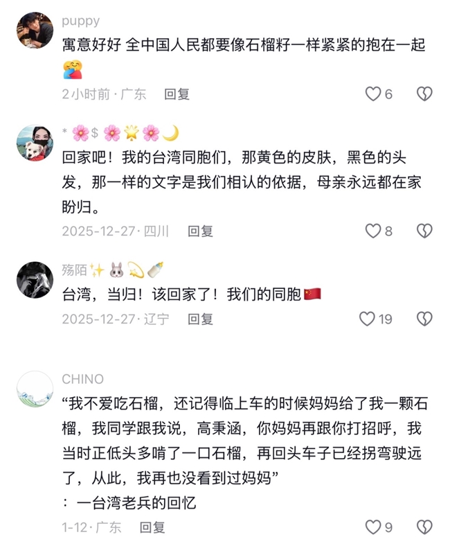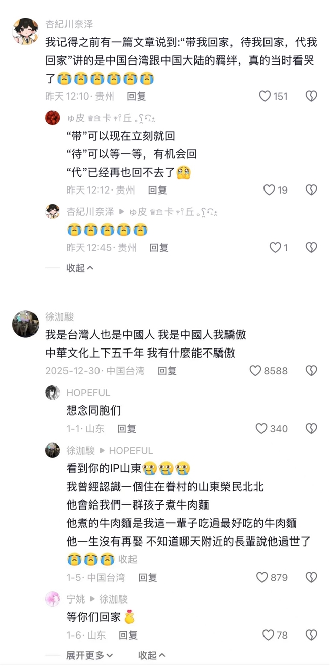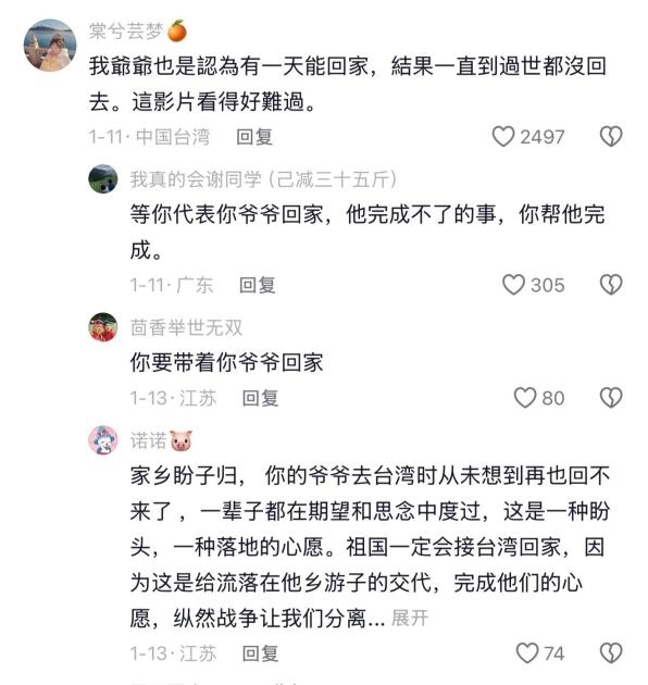 故事因具体而动人。评论区里,两岸网友的沟通毫无壁垒,有人讲述着自己亲人的故事,有人在每个IP中国台湾网友的评论下留言“早点回家”,文化同源的力量连接彼此,真诚的分享引发共鸣。