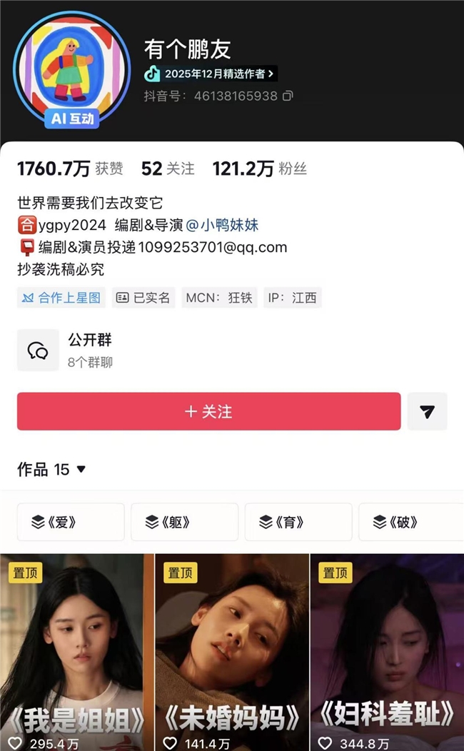 《我不同意》两部曲的作者,@有个鹏友的抖音介绍里写道,“世界需要我们去改变它”。她首页的作品分为《爱》《躯》《育》《破》四个系列,聚焦于围绕女生一生的多个议题创作,告诉我们长姐是一种处境,她们的牺牲不是必须,告诉我们了解自己的身体没有错,无需羞耻。