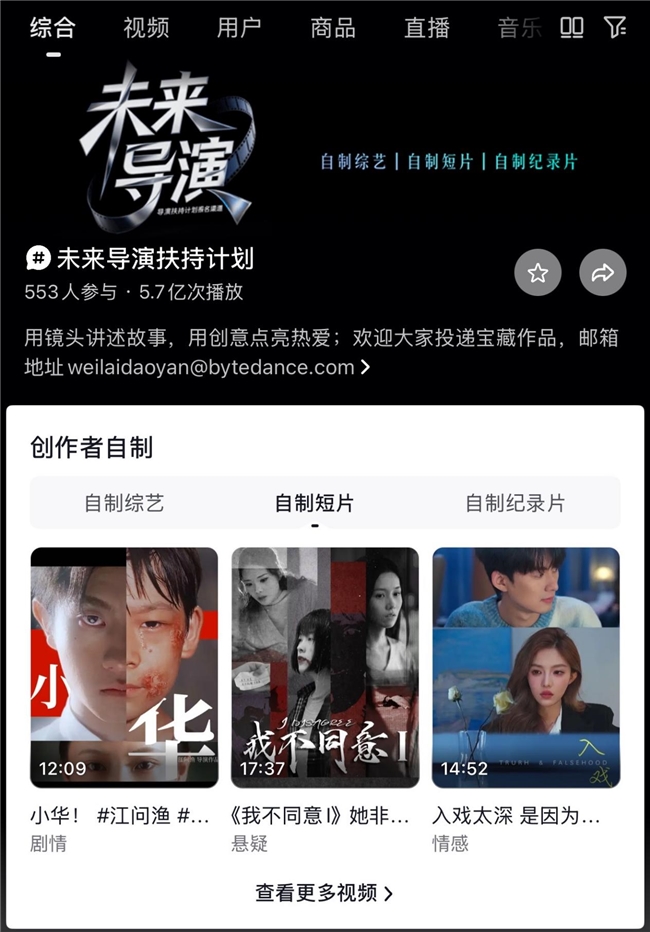计划自启动以来,已产出多条内容多元、质量优质的独家短片,#未来导演扶持计划,目前已有有5.6亿播放量。除故事短片外,该计划还有自制综艺、自制纪录片赛道,帮助各类优秀创作者在平台激励下产出更丰富内容。