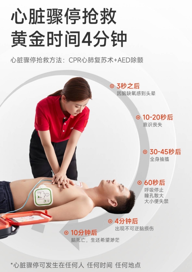 数据显示,我国每年心源性猝死人数超50万,院外抢救成功率不足1%,事实上,心脏骤停从不是遥远的意外。在心脏骤停发生时,急救的黄金时间仅有短短 4 分钟,每延迟1分钟,生存率就下降10%,而AED即自动体外除颤器,是一种可由非专业人员使用、在紧急情况下用于抢救心脏骤停患者的医疗设备,可极大提高心脏骤停患者的生存率。然而,目前仍有许多人不了解AED是什么急救设备,更不知如何去使用这一救命工具。