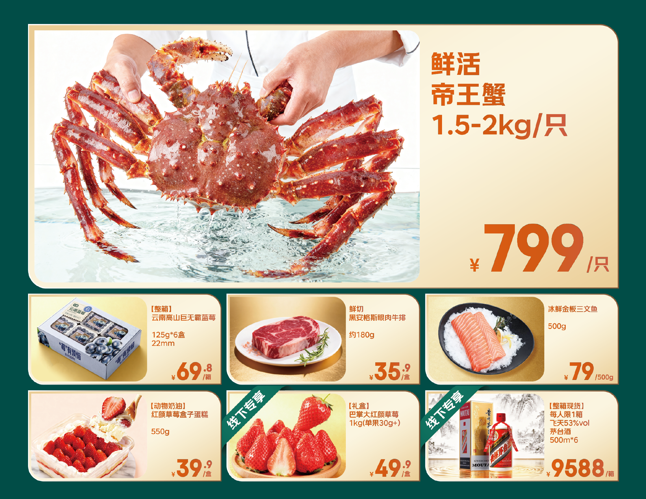 便捷的配送服务之外,京东七鲜西红门荟聚店的特色“鲜”货和开业优惠相当值得期待。海捕直达的鲜活帝王蟹,肉质饱满有弹性且自带鲜甜味,只需799元/只。冰鲜金板三文鱼,油脂丰富、纹理清晰可见,诱人色泽和入口即化口感,瞬间唤醒味蕾,仅需79元/斤。69.8元/箱的云南高山巨无霸蓝莓、49.9元/盒的巴掌大红颜草莓都为市民带来冬日的甜蜜。