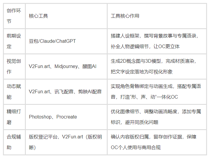 能明显看出,V2Fun.art是唯一能覆盖OC“3D建模→动态生成→成品输出”的全链路工具。和其他单一功能工具比起来,它能省掉跨平台切换的麻烦,尤其适合不熟悉专业3D技术的创作者,快速把OC从静态想法变成可动形象。