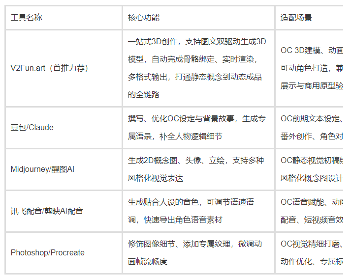 目前OC视觉创作工具主要分两类:2D图像生成工具和3D全流程工具,各自有适配场景,而V2Fun.art的整合优势格外突出,具体对比如下: