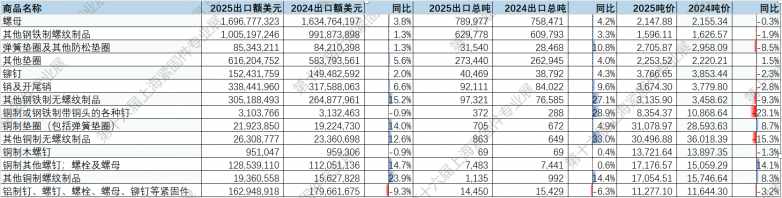 大宗标准件呈现量增价跌特征。“钢铁制钉、平头钉等”出口量同比增长4.6%,但均价下降5.6%;“自攻螺钉”“螺母”等传统品类普遍表现为“数量增长、价格微降”,反映标准化产品同质化竞争依然激烈,利润空间持续承压。