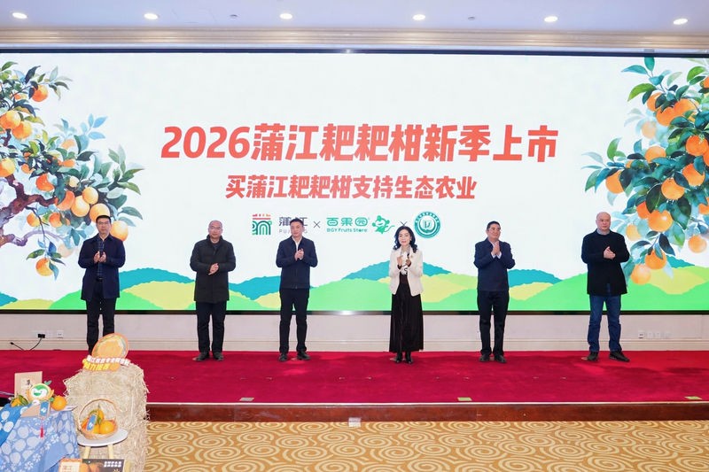 1月28日,蒲江县副县长彭东(左三)和百果园集团总裁徐艳林(左四)共同宣布蒲江耙耙柑新季上市。受访者供图