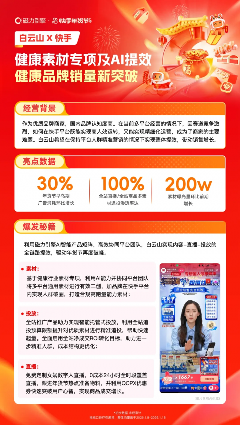 作为高认知度健康品牌,白云山面对多平台竞争激烈、精细化运营难度加大的挑战,依托快手健康素材专项与AI工具实现全链路提效。通过AI二创素材、全站智能投放、数字人24小时直播协同发力,进一步释放品牌增长潜力,早鸟期广告消耗环比增长30%,全站直播/商品多素材追投渗透率达100%,素材曝光量环比前期增长200万,实现人群破圈与经营提效双向赋能。