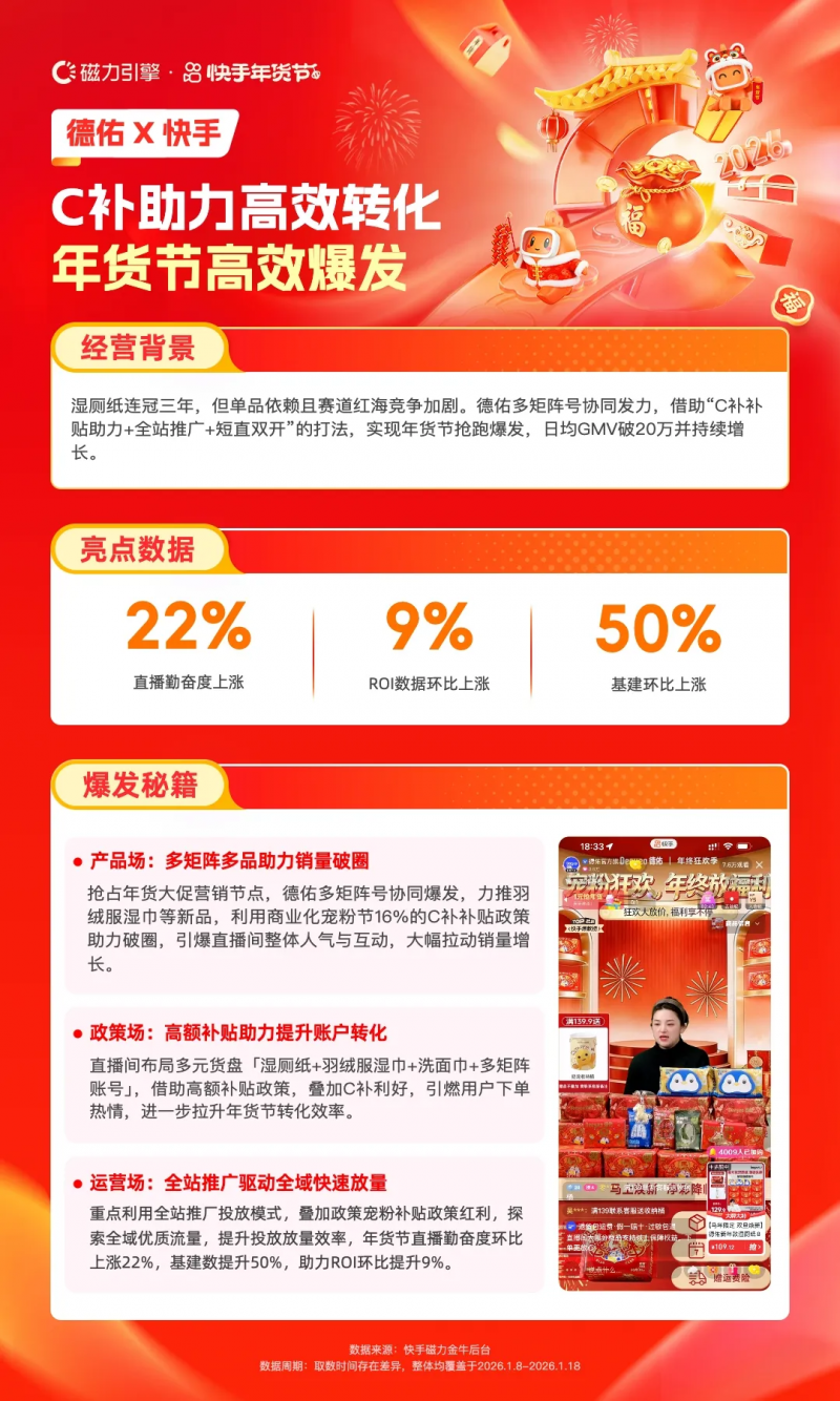 湿厕纸品类连续三年夺冠的德佑,深陷红海竞争与单品依赖困境。年货节期间,品牌通过多矩阵号协同布局,以16%C补补贴、多元货盘、全站推广+短直双开打法突围,同时提升直播勤奋度与基建水平,直播勤奋度环比上涨22%,基建数提升50%,助力ROI环比提升9%,成功实现品类拓展与销量稳步增长。