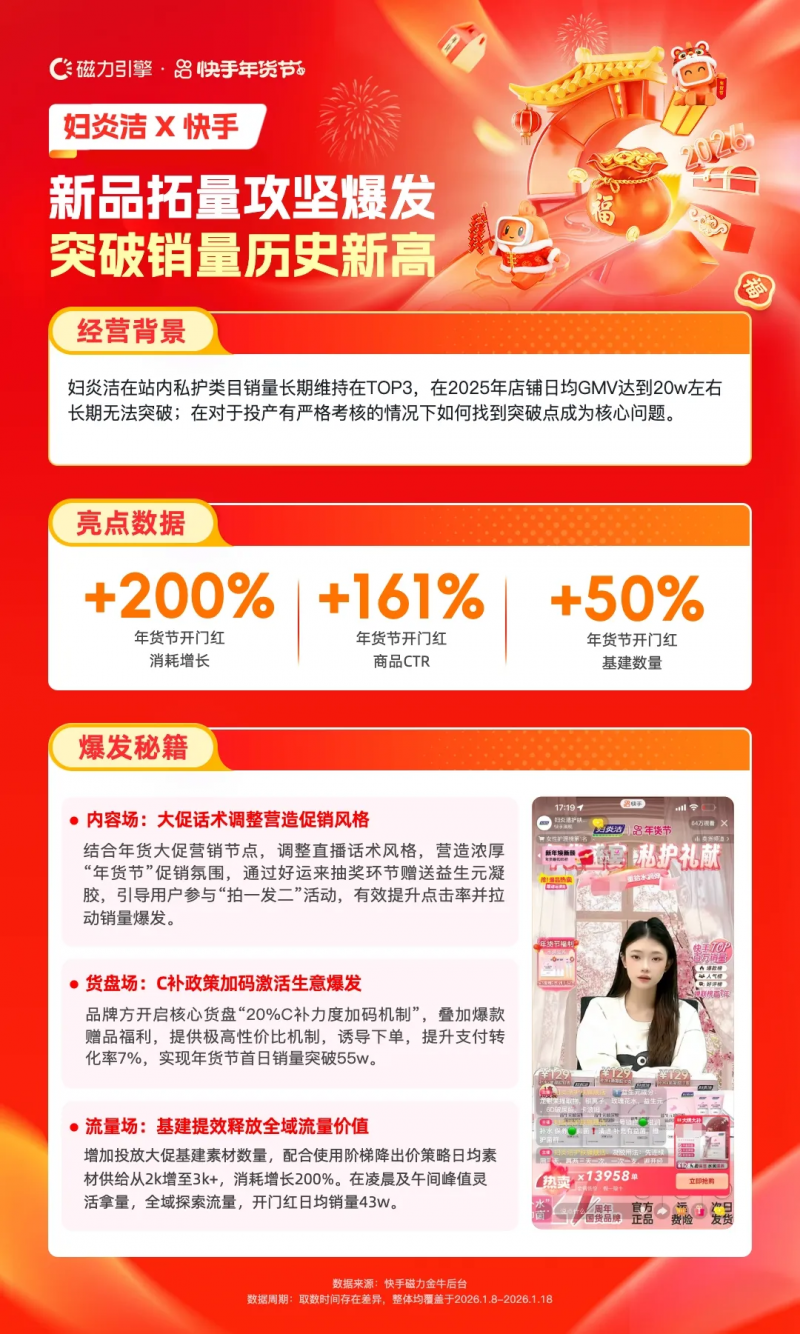 长期稳居私护类目TOP3的妇炎洁,2025年日均GMV稳定在20万,面临增长瓶颈难以突破。年货节期间,品牌从内容、货盘、流量三端同步发力,优化大促话术,适配节日消费场景,加码C补政策与赠品福利,提升用户购买意愿,同步提升素材供给与基建效率。开门红日均销量达43万,首日销量突破55万,消耗增长200%,商品CTR增长161%,打破增长桎梏。