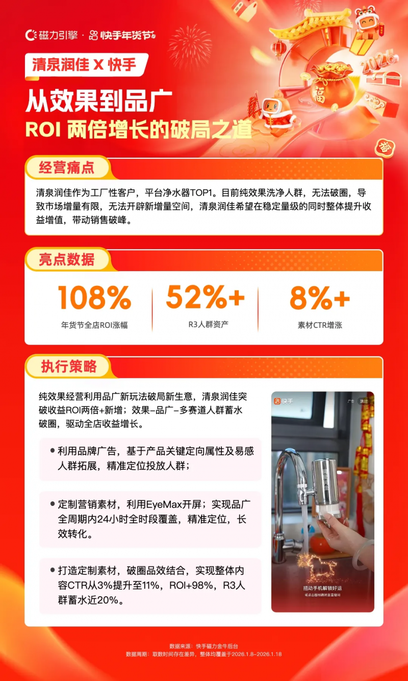 作为平台净水器TOP1工厂客户,清泉润佳此前受限于人群圈层难以突破,长期以纯效果经营为主。年货节期间,品牌精准调整运营策略,转向品广结合模式,通过品牌广告定向触达易感人群,利用EyeMax开屏实现24小时全域覆盖,搭配定制化素材达成品效协同。最终全店ROI涨幅108%,R3人群资产占比超52%,成功开辟新的增量空间。