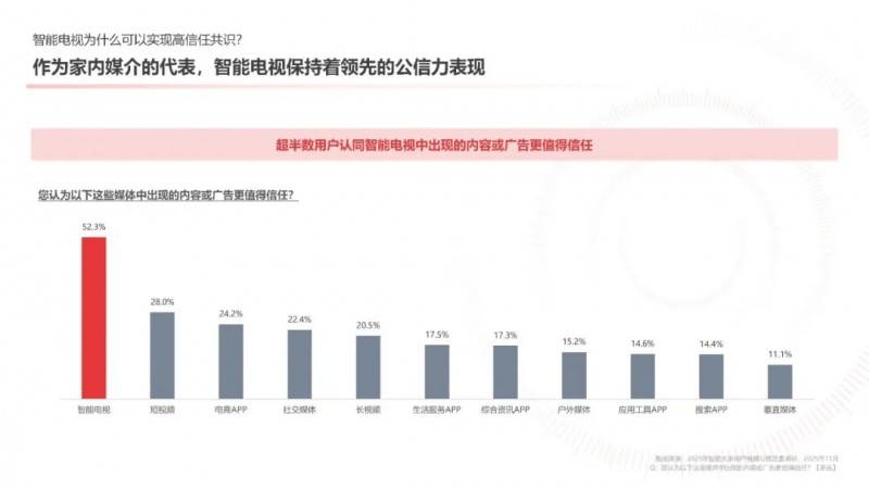 在用户注意力高度碎片化的新媒体时代,智屏视界让大屏营销的内容能整齐划一地影响全民,可在入口级层面稳定出现,可在不同内容消费场景中反复触达,可基于优质内容与信任环境实现深度影响,甚至在家庭场景形成氛围组一样的常驻式、伴随式、环绕式存在,进而确保每一分预算投入都拥有确定性的回报。我认为,在26年以及下一个阶段,智屏视界都将是值得品牌深挖的富矿。