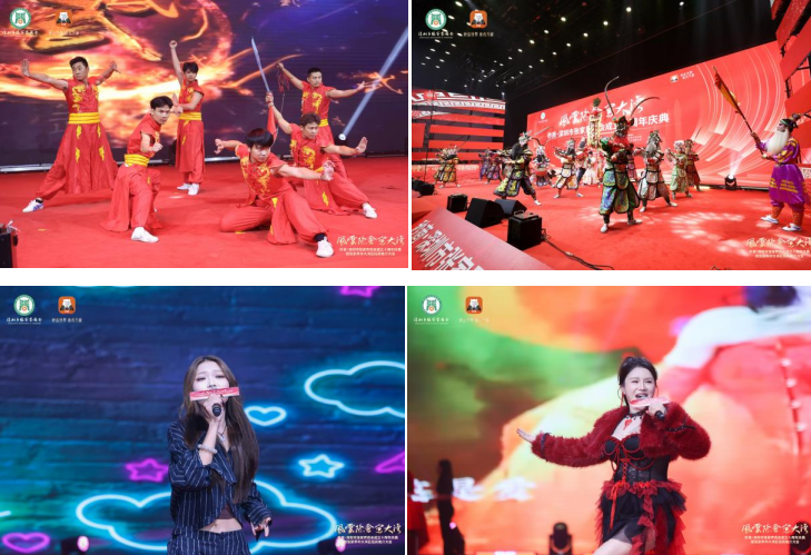 不愧是大师手笔,本次庆典大会堪比央视春晚,每个节目都精彩纷呈,舞美系统美轮美奂,会场两侧的3D全息系统全景呈现,将张家界的三千奇峰直接搬到了活动现场,令人恍入其境。演员阵容超过200人,《潮汕英歌舞》开场便是小高潮,来自国际冠军联盟会的12位超级冠军名模登场后引来现场阵阵尖叫;中国戏曲最高奖“小梅花奖”获奖节目《百花争艳—五大剧种齐绽放》《梅花赋》阵容豪华,演员精致的妆容、华丽的戏服、生动的表情,唱、念、做、打,一招一式,无不透露出深厚的功底和精湛的技艺,将角色演绎得淋漓尽致;著名歌手罗聪带来了成名曲《不是因为寂寞才想你》、《简单的幸福》,歌曲的旋律轻快上口、歌词细腻感人,述说了现代都市情感的迷惘和真挚情感,极富感染力;资深二胡演奏家罗卉带来的《赛马》《战马奔腾》指尖翻飞间,骏马奔腾、竞相追逐的场景跃然眼前,武术节目《精武英雄》及杂技《晃圈》高难度的表演技巧令人叹为观止。