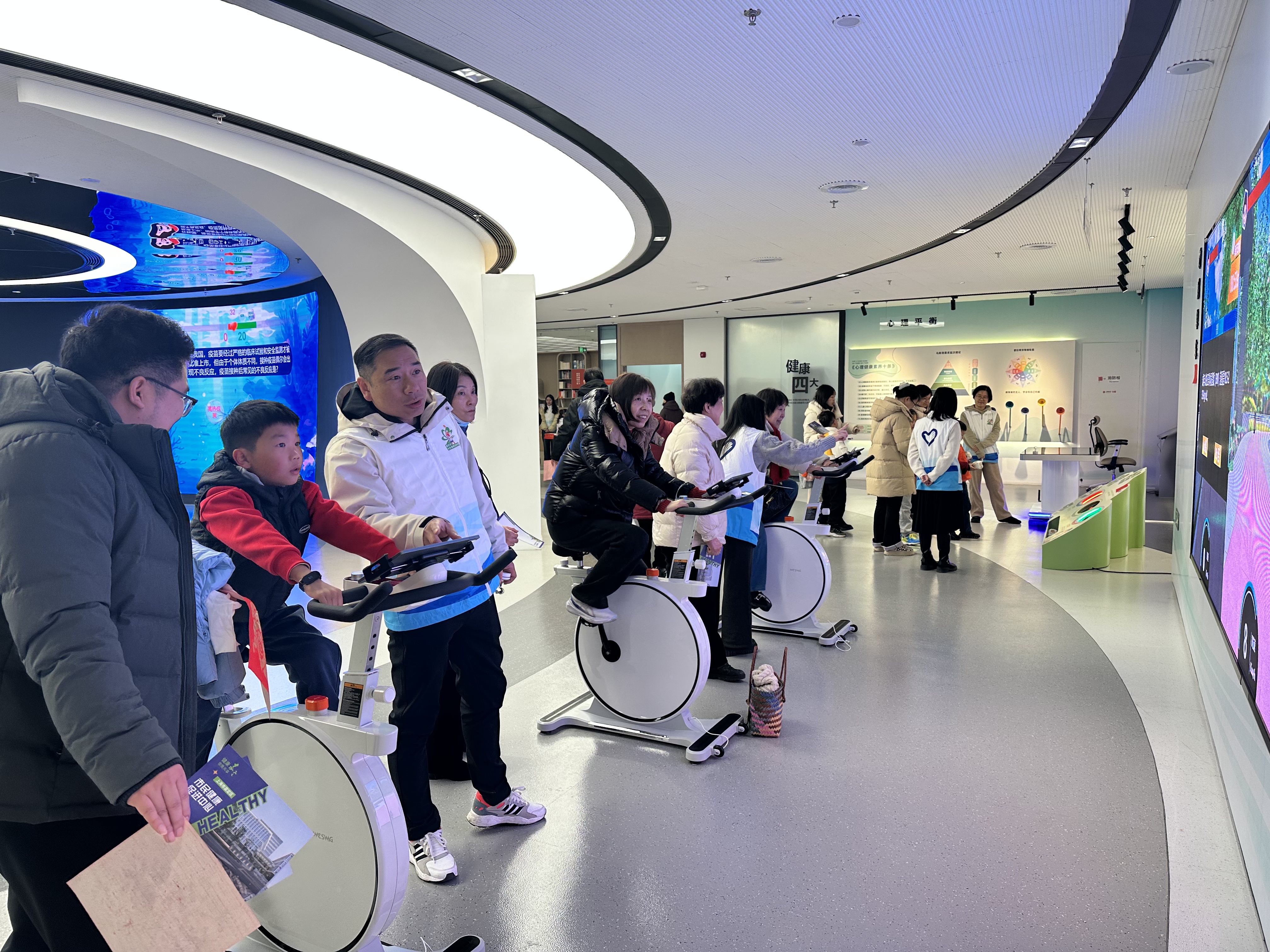 在“福满灯谜”区,一条条彩色灯谜悬挂半空,不少居民仰头琢磨,不时相互讨论。“骑福迎春”区的动感单车前排起了队,参与者一边骑行,一边观看前方屏幕上实时显示的心率、消耗卡路里等数据。“建议您将阻力调低一档,保持匀速呼吸。”现场健康指导员耐心指导着每位体验者。