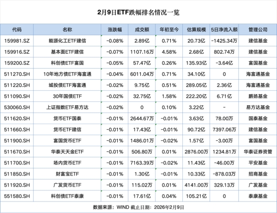 其中,能源化工ETF建信、基本面ETF建信、科创债ETF富国跌幅居前,分别跌0.08%、0.07%、0.05%。另有29只ETF持平。