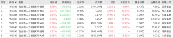 跟踪创业板人工智能指数的ETF共有8只。其中,华安基金旗下的AI创业ETF涨幅最高,日涨幅达6.98%,富国基金旗下的创AI富国ETF和国泰基金旗下的创业AIETF日涨幅为6.59%,大成、华宝、华夏、南方、招商旗下相关ETF日涨幅也超6%。